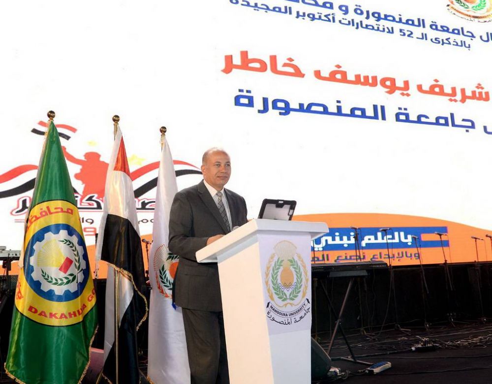 The program also included a dialogue seminar with retired Major General Abdel Moneim Ibrahim Hammam, Staff Pilot, and retired Major General Medhat Labib Sadek, moderated by journalist Hazem Nasr, Editor-in-Chief of Akhbar Al-Youm newspaper and Head of the Dakahlia Journalists Syndicate. A patriotic artistic segment was also presented by the Mansoura University Choir, led by maestro Dr. Amr El-Morsi.