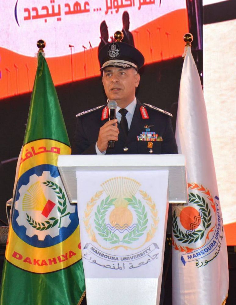 Major General Amr Attia extended his thanks and appreciation to the President of Mansoura University and the Governor of Dakahlia for hosting this honorable celebration, which reflects the spirit of patriotism and belonging among the people of the governorate. He emphasized that the Armed Forces are always proud of Egypt's educated, aware youth, capable of carrying the nation's banner. The program included a panoramic presentation documenting the epics of the glorious October victory, produced by the university's Media Center, and an educational seminar titled "Strategic Deterrence," delivered by Major General Dr. Nasr Salem, former head of the Reconnaissance Service, who addressed the lessons of the October War in building defense capabilities.