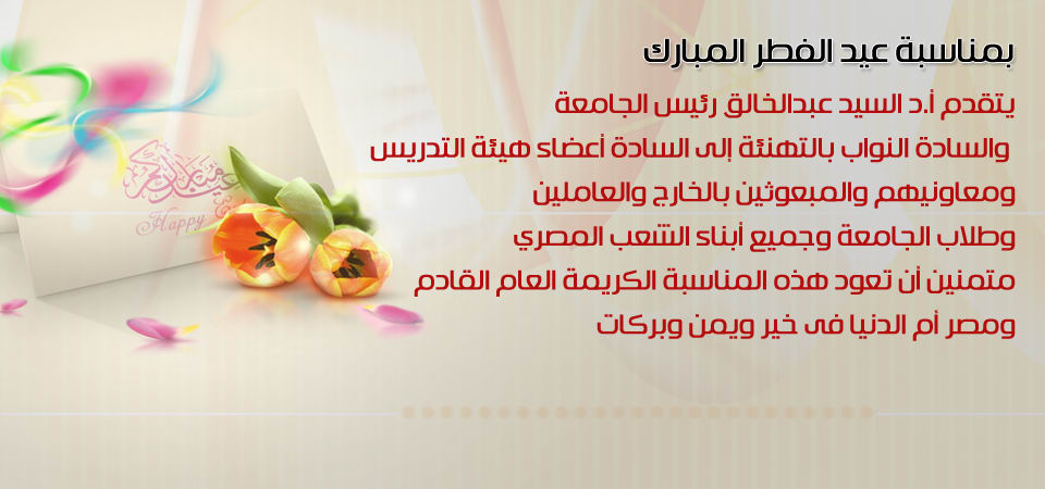 يتقدم أ.د السيد عبدالخالق رئيس الجامعة والسادة النواب بالتهنئة إلى السادة أعضاء هيئة التدريس ومعاونيهم والمبعوثين بالخارج والعاملين وطلاب الجامعة وجميع أبناء الشعب المصري متمنين أن تعود هذه المناسبة الكريمة العام القادم ومصر أم الدنيا فى خير ويمن وبركات، وكل عام وأنتم بخير