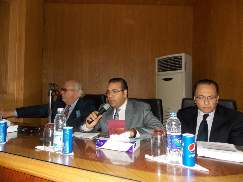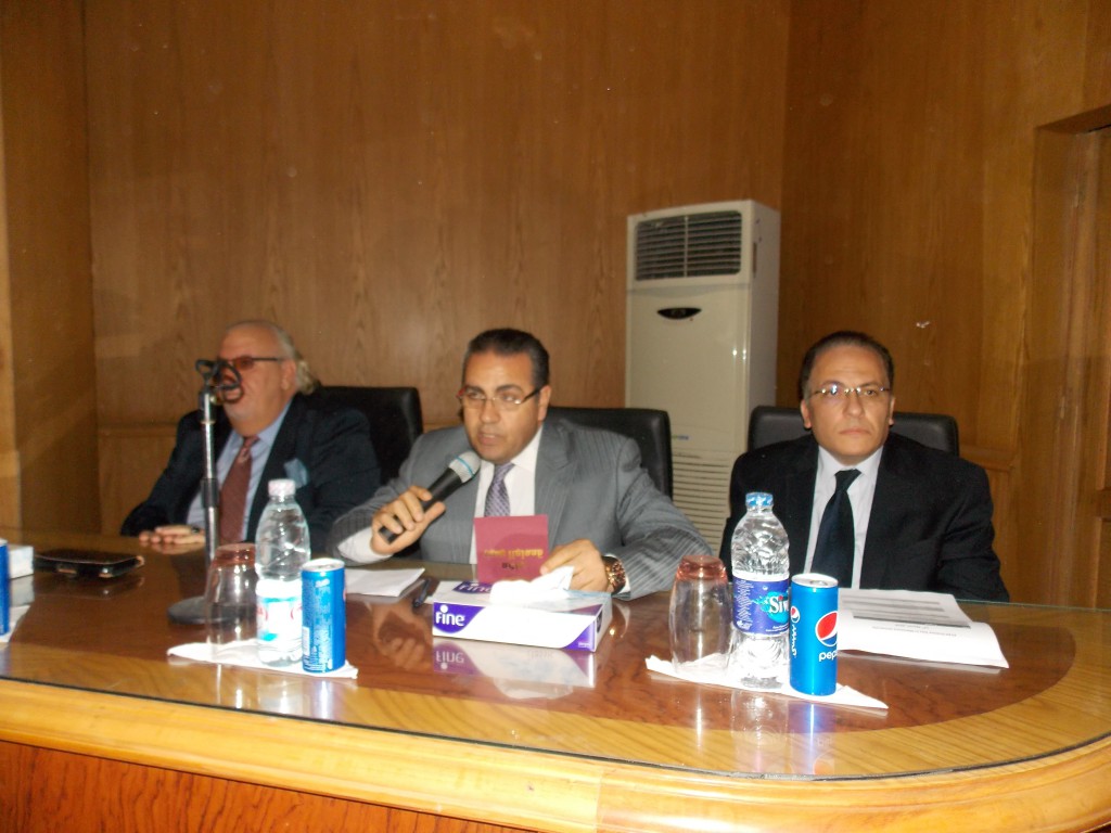 بحضور الاستاذ الدكتور/ محمد القناوى- رئيس الجامعة والاستاذ الدكتور/ محمد الحديدى- القائم بعمل عميد الكلية والاستاذ الدكتور/ احمد بدوى- وكيل الكلية للدراسات العليا والبحوث.