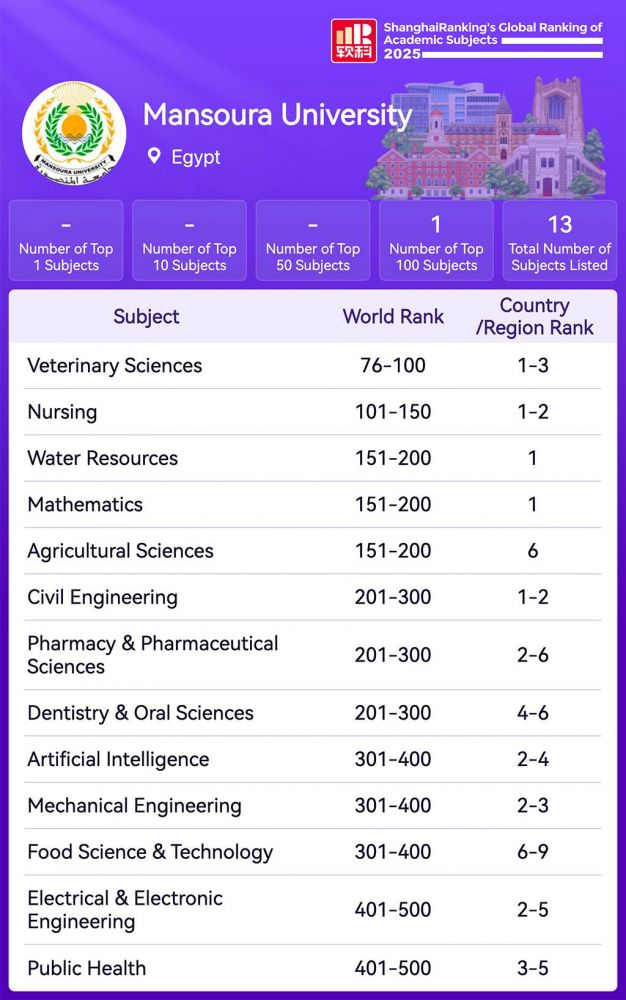 جامعة المنصورة تواصل إنجازاتها الدولية في تصنيف شنغهاي للتخصصات الأكاديمية لعام 2025