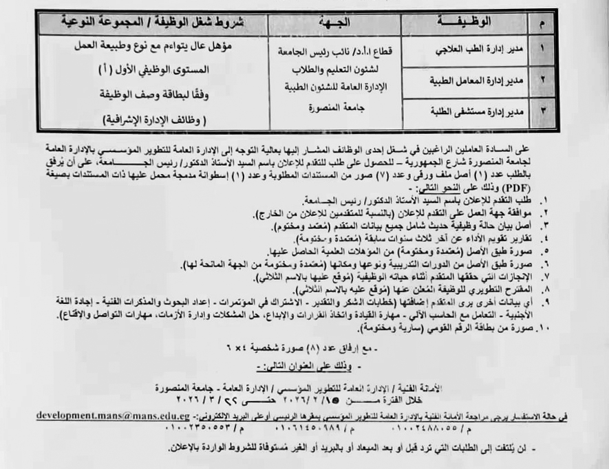 اعلان جامعة المنصورة عن حاجتها لشغل الوظائف الاشرافية التالية